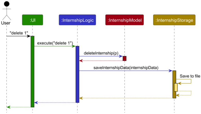 The sequence diagram below illustrates the interactions within the InternshipLogic component, taking execute("delete 1") API call as an example.